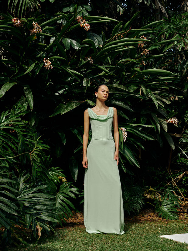 Conjunto composto por corset com manga e babado no torso e saia leve, feitos em seda. Saia apresenta ziper e corset amarração nas costas com fita de gogorao.