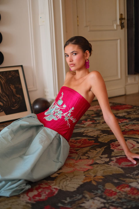 Corset tomara que caia em shantung de seda rustico com bordado azul. O corset tem amarração nas costas.