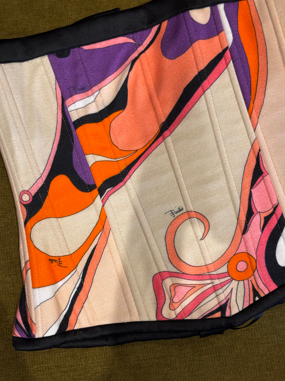 Corset com tecido PUCCI vintage. Apresenta amarração nas costas com fita em gorgorão. Detalhe em viscoseda.
